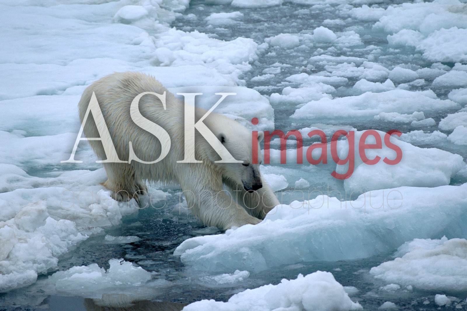 | Description | Polar bear has trouble crossing from one ice floe to another in summer pack ice. Spitsbergen. |