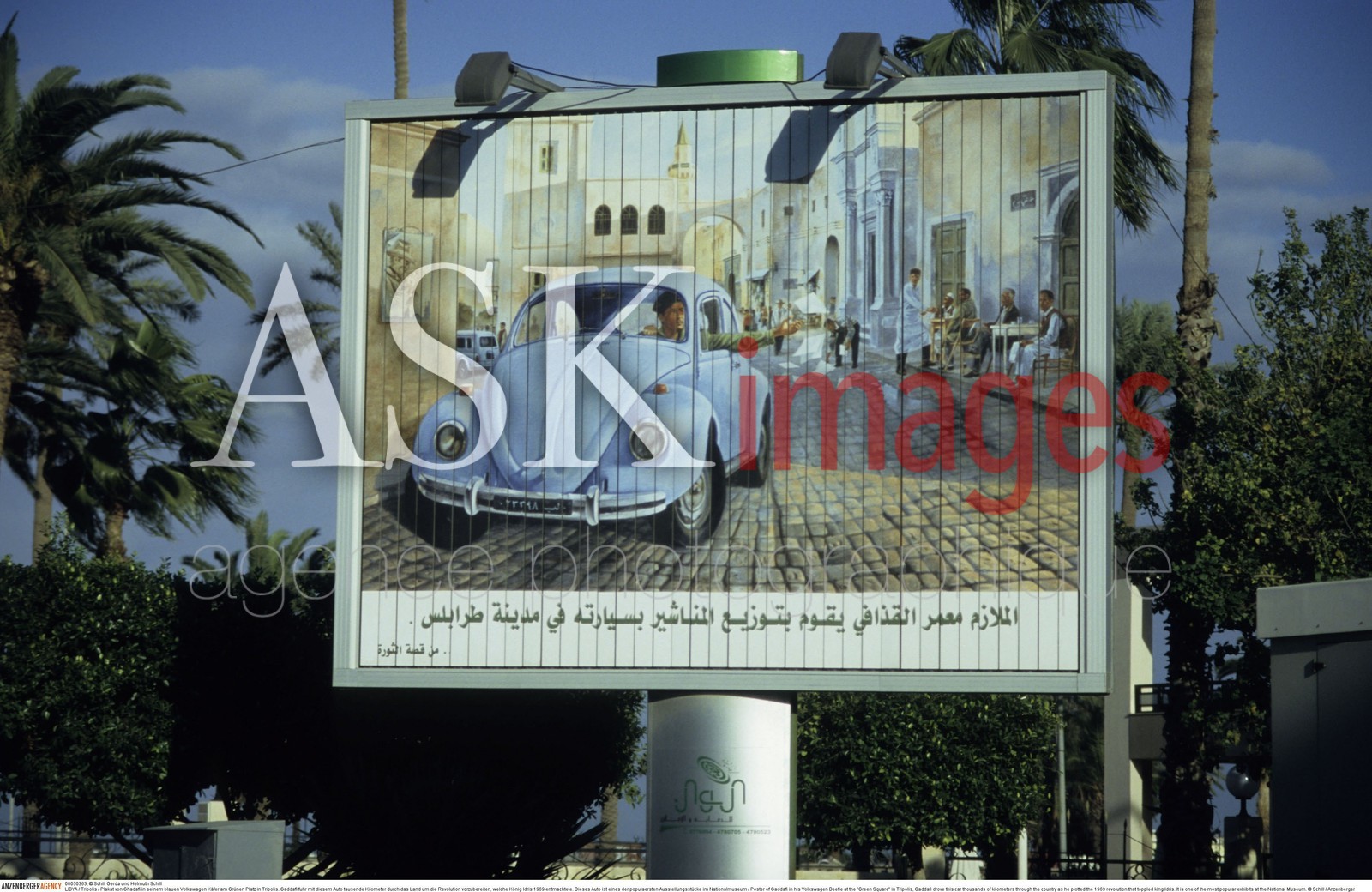 | Description | Poster of Gaddafi in his Volkswagen Beetle at the "Green Square" in Tripolis, Gaddafi drove this car thousands of kilometers through the country as he plotted the 1969 revolution that toppled king Idris. It is one of the most popular exhibits at the National Museum..© Schill / Anzenberger |
