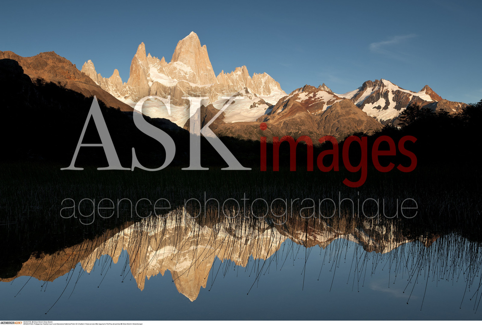 DescriptionARGENTINA / Patagonia / Santa Cruz / Los Glaciares National Park / El Chalten / View across little laguna to Fitz Roy at sunrise..© Oliver Bolch / Anzenberger