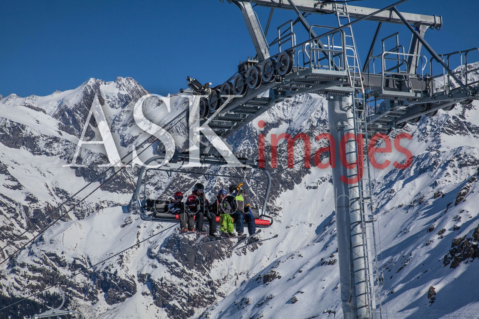 Contamines-Montjoie, skiers on chair lift.