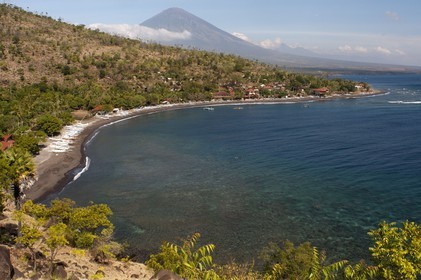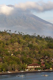 The small village of Amed fisherman with views of Mount Gunung Agung background (3142m). East Bali. Amed is a long coastal strip of fishing villages in East Bali.