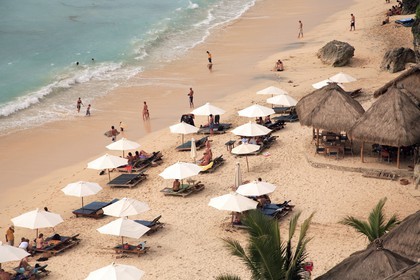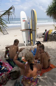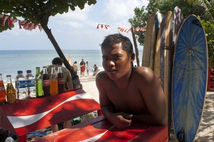 Indonesia, Bali, Kuta, beach, woman food massage. Sunbath on the beach of Kuta. Surfing lessons. Bali. Kuta is a coastal town in the south of the island of Lombok in Indonesia.