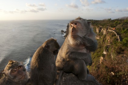 Monkeys along the cliffs next to the Ulu Watu temple Pura Luhur. Bali. Uluwatu Temple is a Hindu temple set on the cliff bank in south part of Bali Peninsula. It is one of Sad Kahyangan Temple in Bali (six big groups of Bali Temples)
