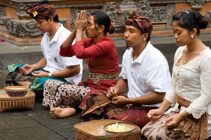 A BALINESE family and friends prays at PURA TIRTA EMPUL a Hindu Temple complex and cold springs - TAMPAKSIRING, BALI, INDONESIA. Several people pray and leave offerings in the Holy Monkey Forest during the celebration of Galungan.