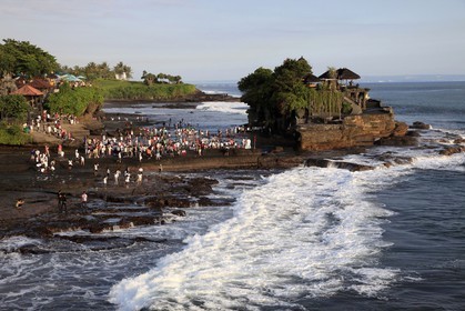 Tourists along the cliffs next to the Ulu Watu temple Pura Luhur. Bali. Uluwatu Temple is a Hindu temple set on the cliff bank in south part of Bali Peninsula. It is one of Sad Kahyangan Temple in Bali (six big groups of Bali Temples)