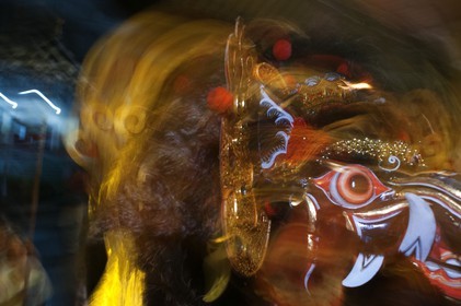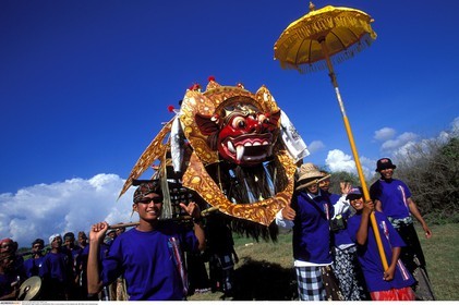 Several young people play music and they disguised dragon through the streets of Ubud during the celebration of Galungan. Galungan festival, the most important of Bali, symbolizes the victory of Drama (virtue) over Adharma (evil).