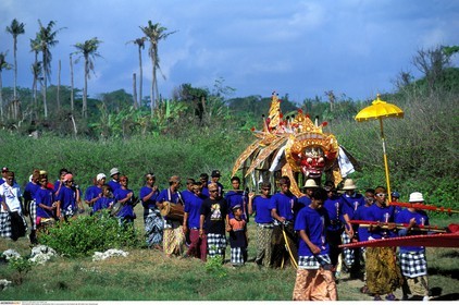 Several young people play music through the streets of Ubud during the celebration of Galungan. Galungan festival, the most important of Bali, symbolizes the victory of Drama (virtue) over Adharma (evil).