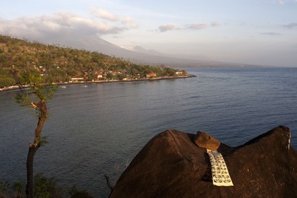 A prayer on a rock overlooking the small fishing village of Amed, with Gunung Agung mountain background (3142m). East Bali.