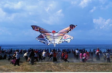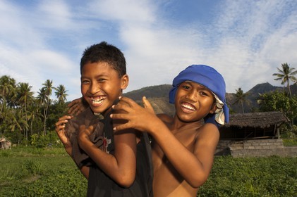 Two young people having fun in a field near the fishing village of Amed East Bali culture. Amed is a long coastal strip of fishing villages in East Bali. Amed refers to a long stretch of coast running from the village of Cucik about 14 km eastwards incorporating the seven villages