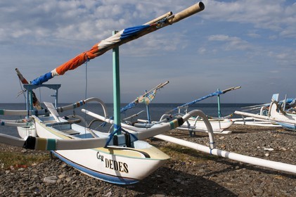 A fisherman with several fishing boats on the beach of Amed, a small fishing village in East Bali. Amed is a long coastal strip of fishing villages in East Bali.