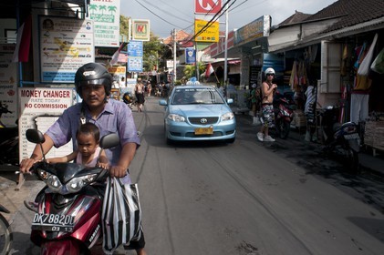 Taxi and motorbike in the Streets of Kuta. Indonesia, Bali, touristic streets of Kuta. Bali. Most of Lombok's south coasts offer surf-seekers challenging waves of various grades.