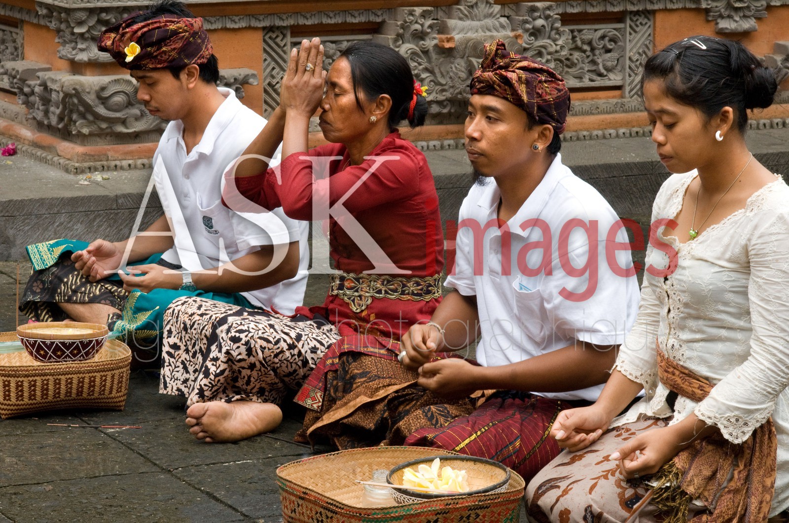 DescriptionA BALINESE family and friends prays at PURA TIRTA EMPUL a Hindu Temple complex and cold springs - TAMPAKSIRING, BALI, INDONESIA. Several people pray and leave offerings in the Holy Monkey Forest during the celebration of Galungan.