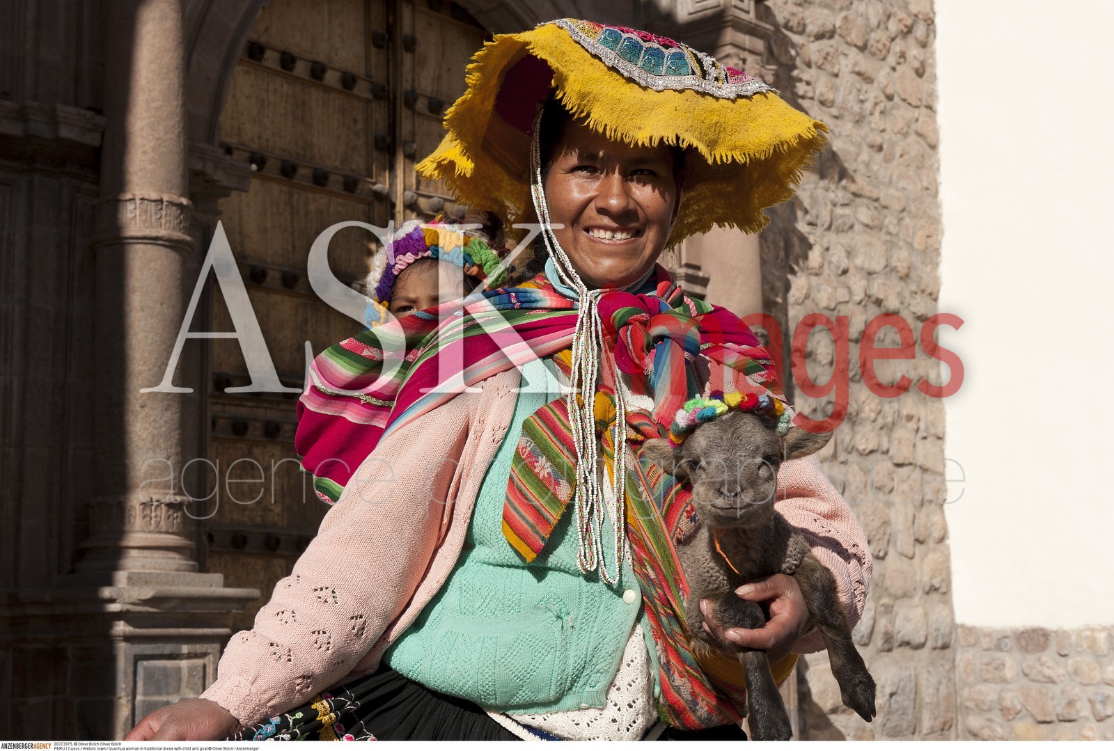 DescriptionPERU / Cusco / Historic town / Quechua woman in traditional dress with child and goat..© Oliver Bolch / Anzenberger