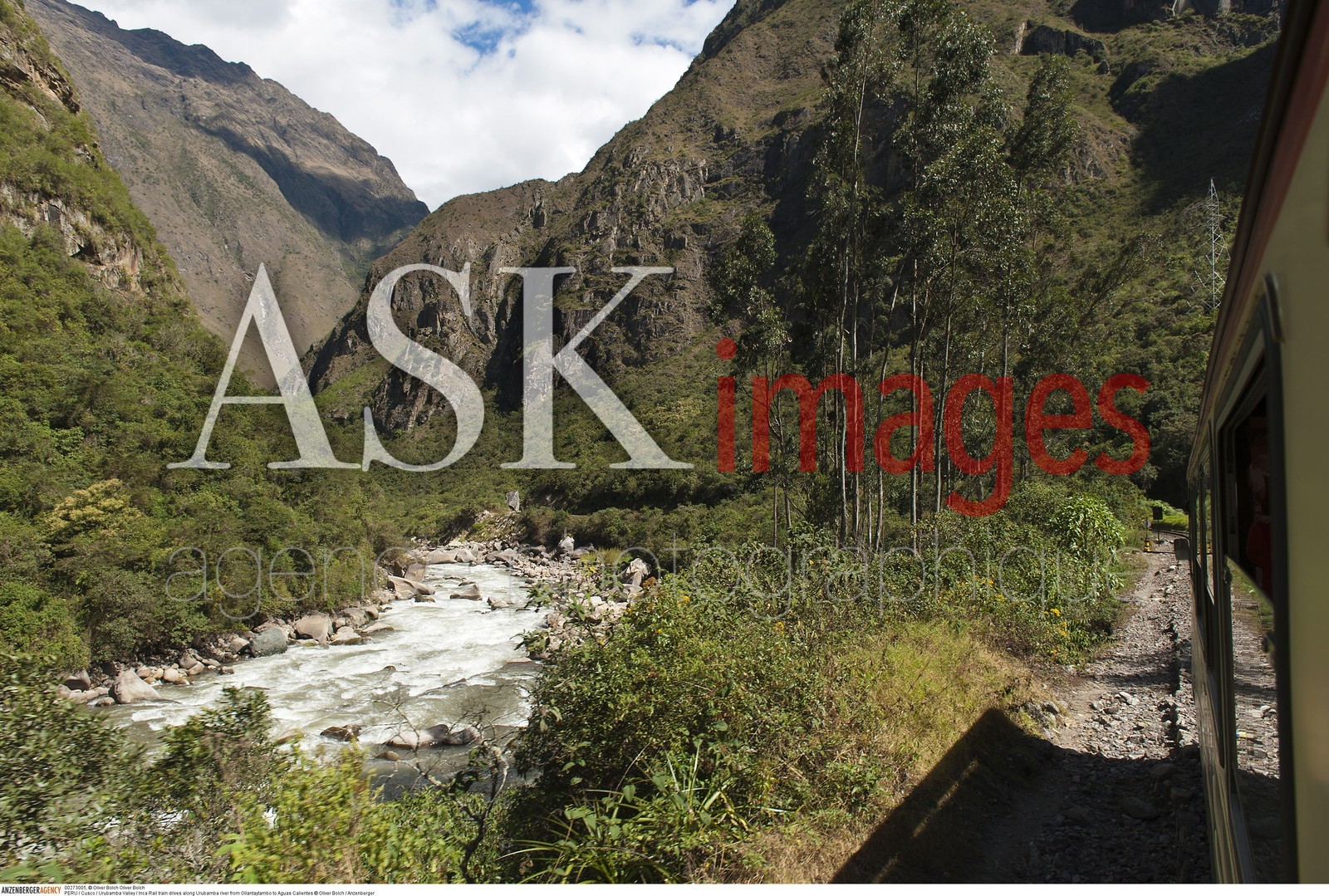 DescriptionPERU / Cusco / Urubamba Valley / Inca Rail train drives along Urubamba river from Ollantaytambo to Aguas Calientes..© Oliver Bolch / Anzenberger