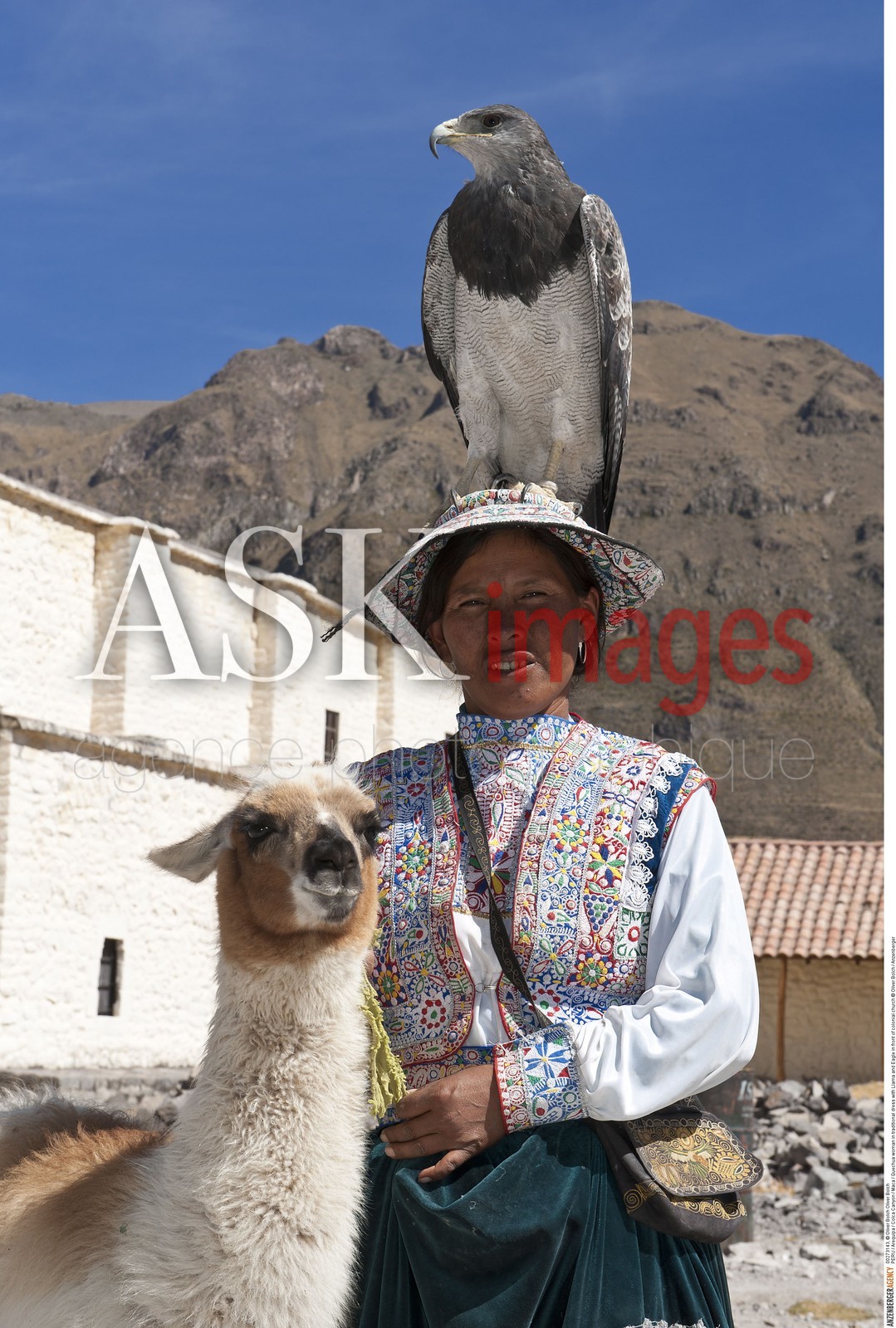 | Description | PERU / Arequipa / Colca Canyon / Maca / Quechua woman in traditional dress with Llama and Eagle in front of colonial church..© Oliver Bolch / Anzenberger |