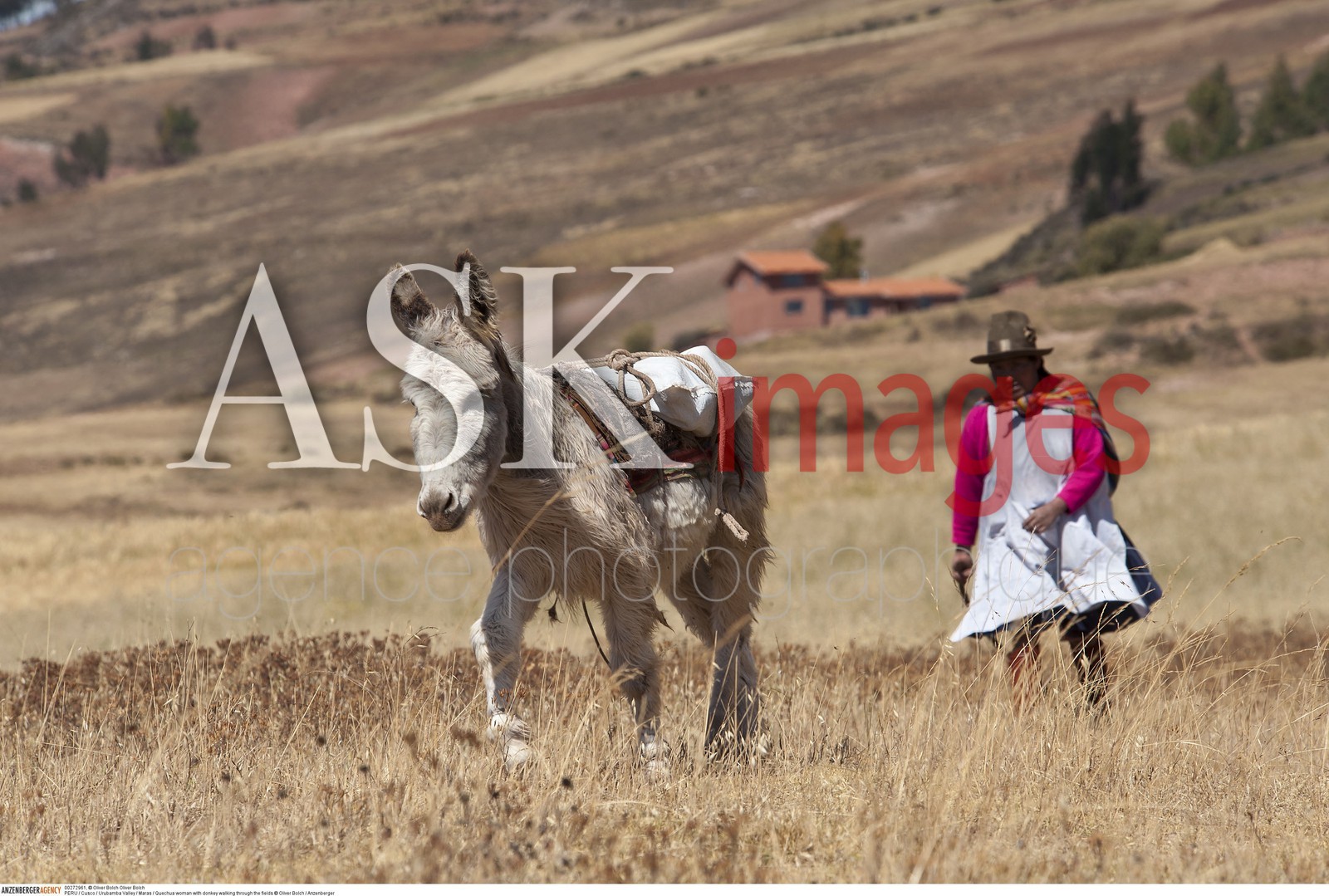 | Description | PERU / Cusco / Urubamba Valley / Maras / Quechua woman with donkey walking through the fields..© Oliver Bolch / Anzenberger |
