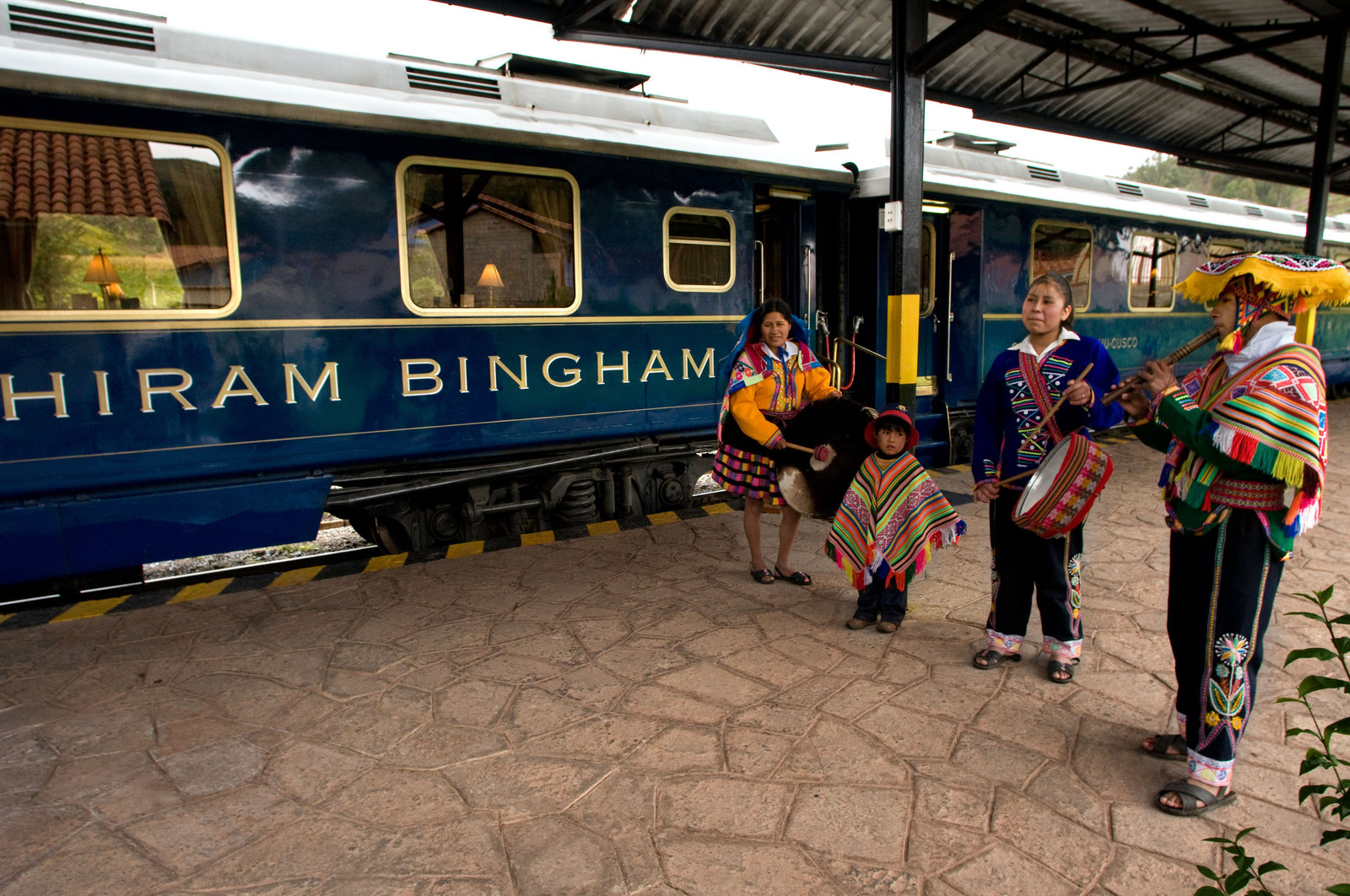 | Description | Peru Luxury train from Cuzco to Machu Picchu, Orient Express, Belmond, Musicians and dancers in traditional costumes in the Hiram Bingham Orient Express which runs between Cuzco and Machu Picchu. |
