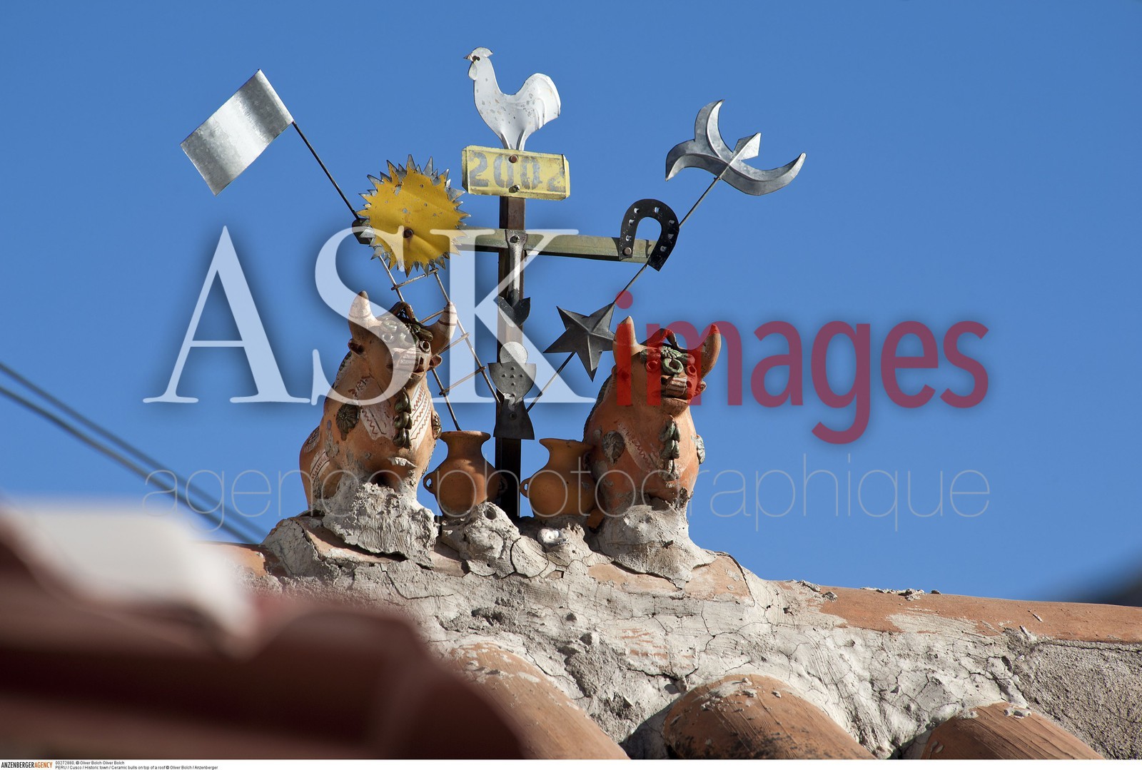 DescriptionPERU / Cusco / Historic town / Ceramic bulls on top of a roof..© Oliver Bolch / Anzenberger