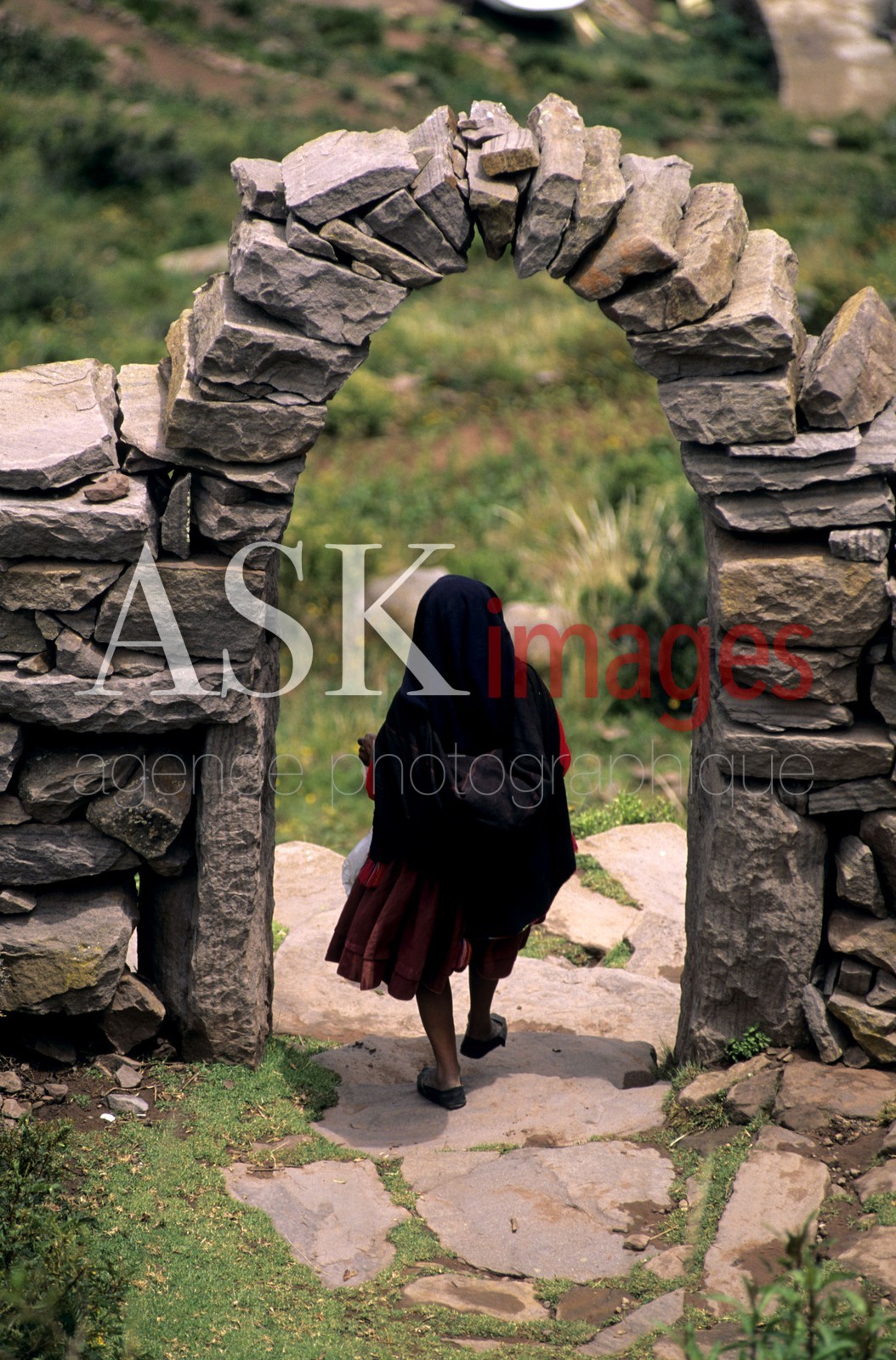 PERU / Puno / Lake Titicaca / Taquile Island / View through stone arch