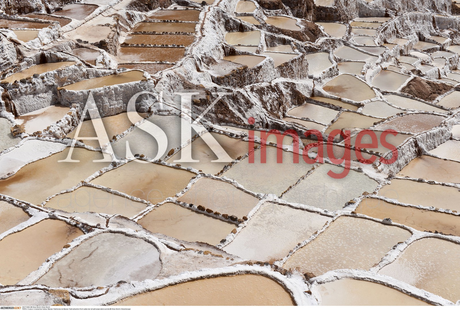 | Description | PERU / Cusco / Urubamba Valley / Maras / Salineras de Maras / Salt extraction from salty river at salt evaporation ponds..© Oliver Bolch / Anzenberger |