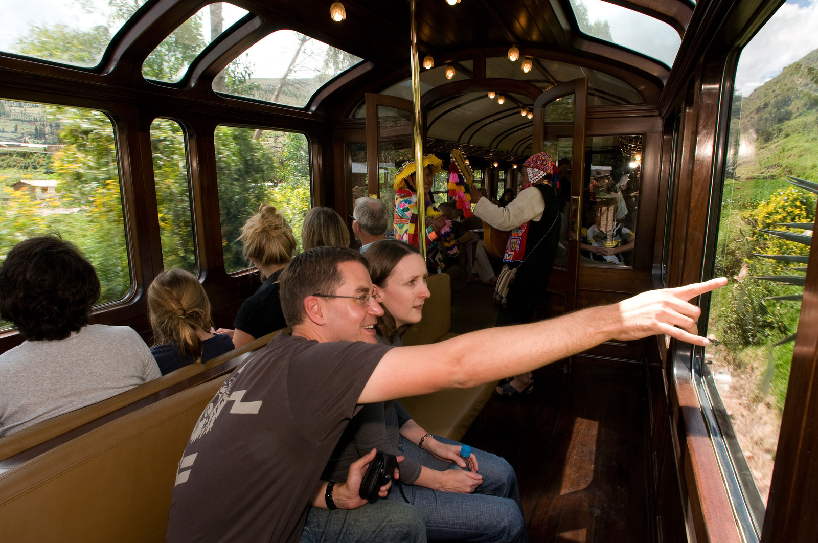 DescriptionAndean Explorer, luxury train from Cusco to Puno, Observation car entertained by musicians and dancers in traditional costumes at the Andean Explorer train Orient Express which runs between Cuzco and Puno.