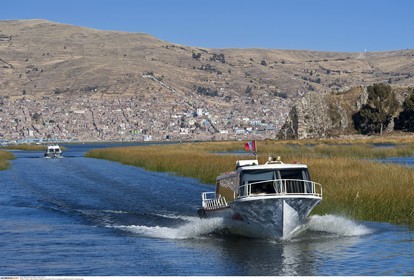• PERU / Puno / Lake Titicaca / Boat on lake with Puno in background..© Oliver Bolch / Anzenberger