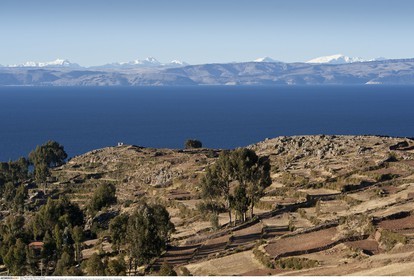 • PERU / Puno / Lake Titicaca / Taquile Island / View across island with Cordillera Real on the Bolivian side in the background..© Oliver Bolch / Anzenberger