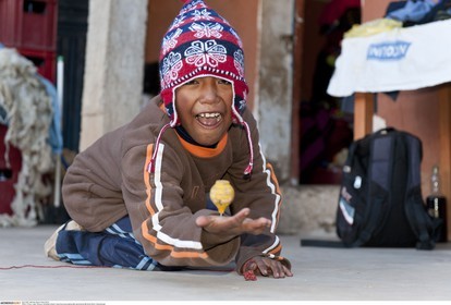 • PERU / Puno / Lake Titicaca / Amantani Island / Quechua boys playing with spinning top..© Oliver Bolch / Anzenberger
