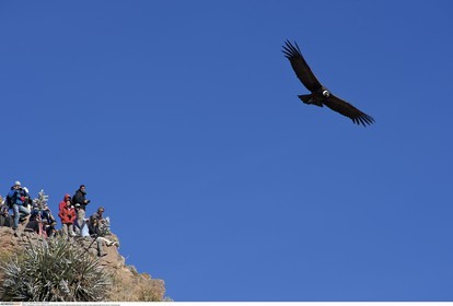 • PERU / Arequipa / Colca Canyon / Cruz del Condor / People watching flying Andean Condor (Vultur gryphus)..© Oliver Bolch / Anzenberger