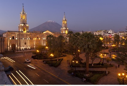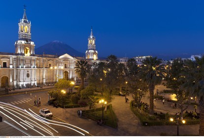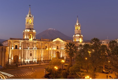 • PERU / Arequipa / Historic town / Plaza de Armas / Basilica Cathedral of Arequipa with volcano Misti in background at dusk..© Oliver Bolch / Anzenberger