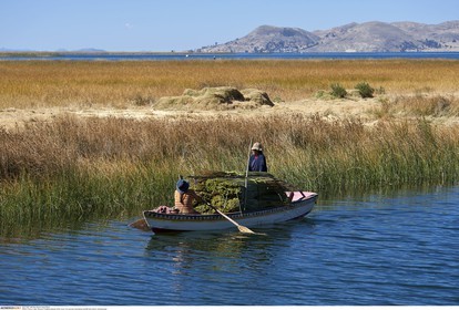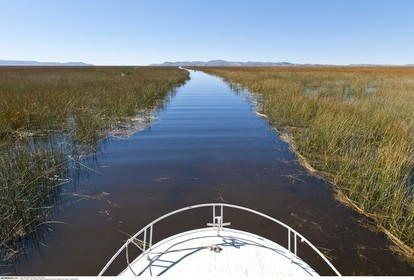 • PERU / Puno / Lake Titicaca / Boat driving through reed-belt..© Oliver Bolch / Anzenberger