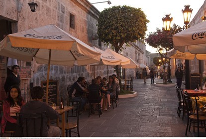 • PERU / Arequipa / Historic town / Plaza de Armas / Paseo de la Catedral / Pedestrian lane with bars and restaurants at dusk..© Oliver Bolch / Anzenberger