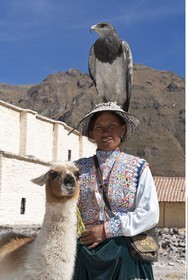 • PERU / Arequipa / Colca Canyon / Maca / Quechua woman in traditional dress with Llama and Eagle in front of colonial church..© Oliver Bolch / Anzenberger