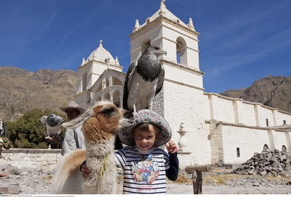 • PERU / Arequipa / Colca Canyon / Maca / Tourist child with Llama and Eagle in front of colonial church..© Oliver Bolch / Anzenberger