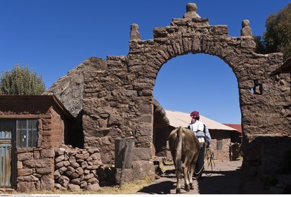 • PERU / Puno / Lake Titicaca / Taquile Island / View through stone arch ..© Oliver Bolch / Anzenberger