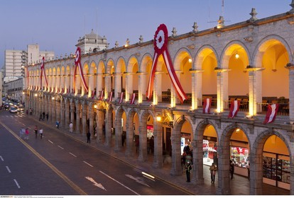 • PERU / Arequipa / Historic town / Plaza de Armas / Arcade Bolognesi at dusk..© Oliver Bolch / Anzenberger