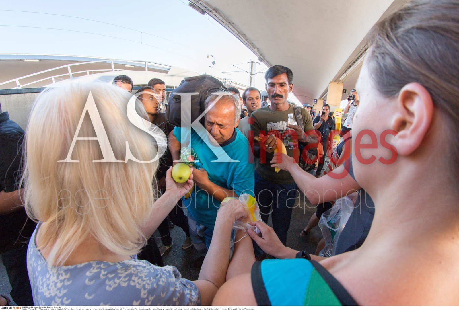 DescriptionAustria / Vienna / 2015 / Refugees on the Wien Westbahnhof train station changing to a train to Germany. Volunteers supporting them with food and water...They came through Serbia and Hungary, crossed the Austrian border and travelled on towards their final destination - Germany...© Georges Schneider / Anzenberger