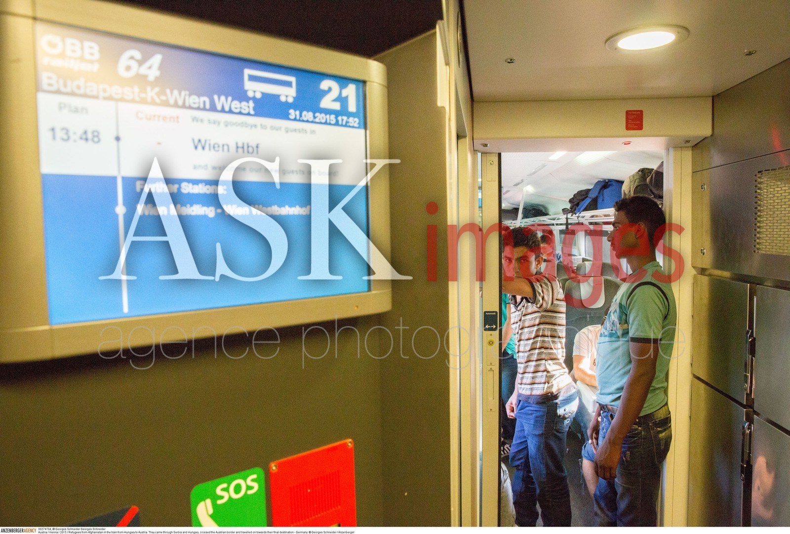 DescriptionAustria / Vienna / 2015 / Refugees in the train from Hungary to Austria. ..They came through Serbia and Hungary, crossed the Austrian border and travelled on towards their final destination - Germany...© Georges Schneider / Anzenberger