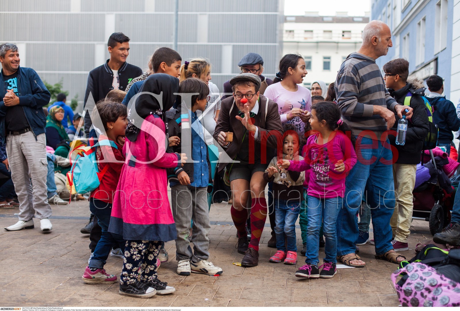 DescriptionAustria / Vienna / 2015 / Clowns for Refugees / Clowns and actors: Peter Spindler and Martin Duskanich performing for refugees at the Wien Westbahnhof railway station in Vienna..© Petra Rautenstrauch / Anzenberger/ASK Images