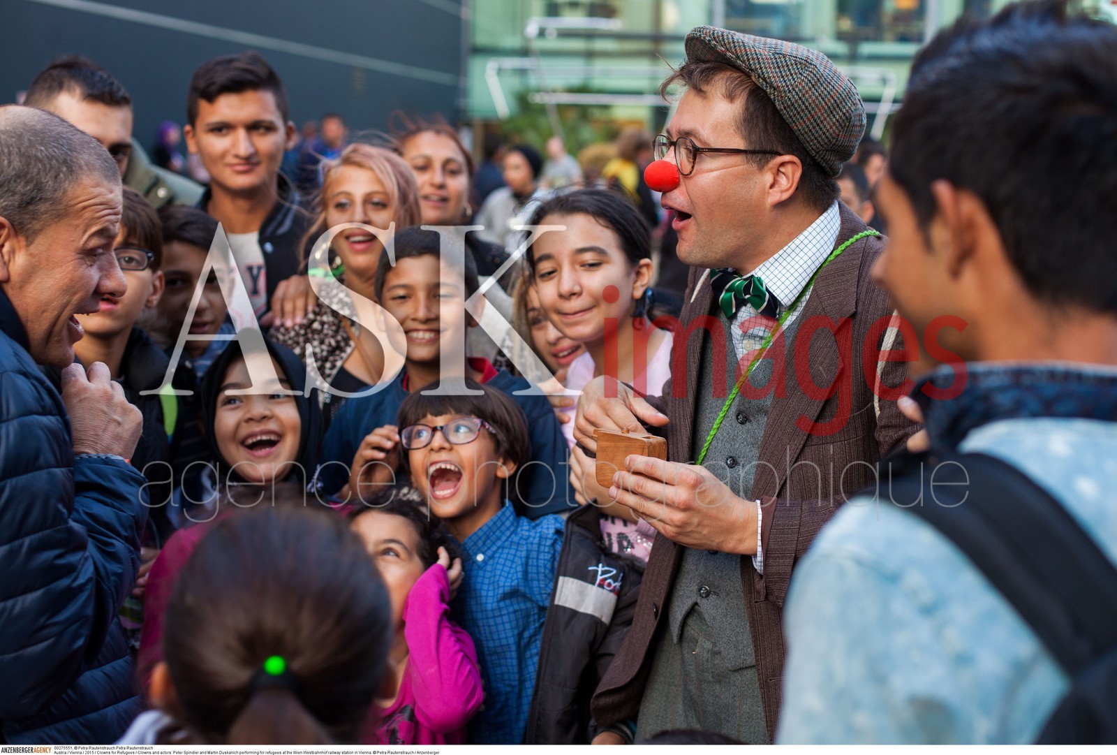 | Description | Austria / Vienna / 2015 / Clowns for Refugees / Clowns and actors: Peter Spindler and Martin Duskanich performing for refugees at the Wien Westbahnhof railway station in Vienna..© Petra Rautenstrauch / Anzenberger/ASK Images |