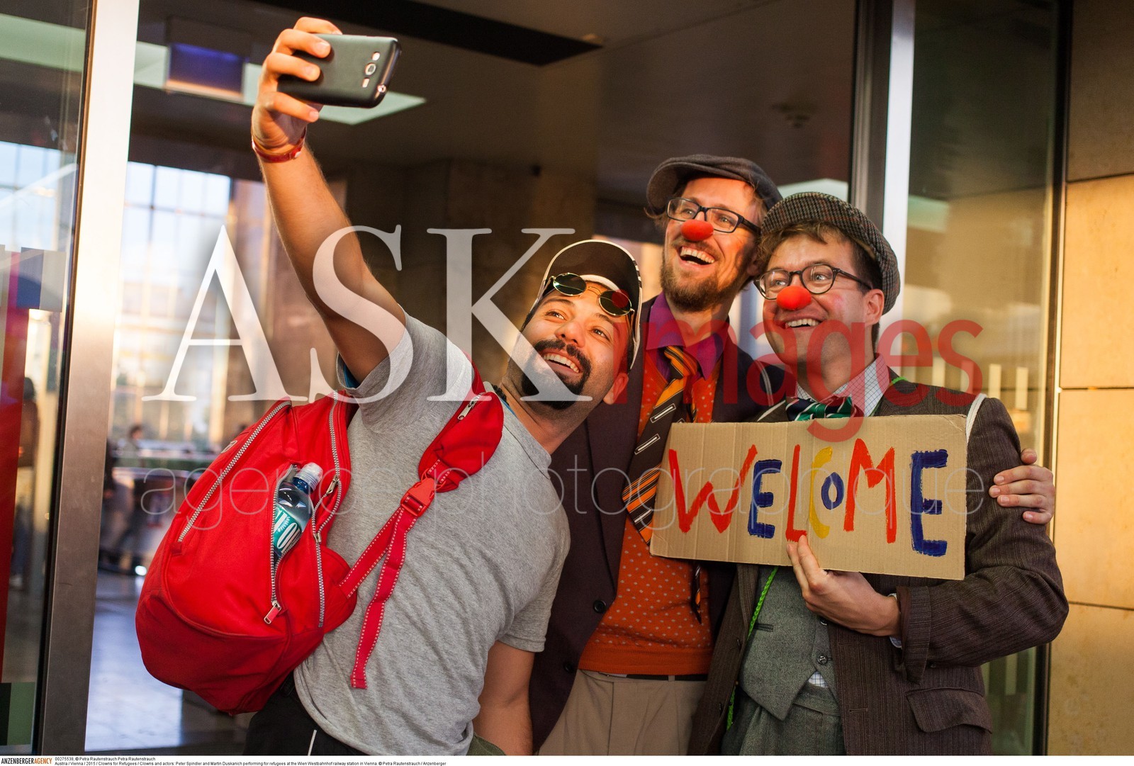 | Description | Austria / Vienna / 2015 / Clowns for Refugees / Clowns and actors: Peter Spindler and Martin Duskanich performing for refugees at the Wien Westbahnhof railway station in Vienna..© Petra Rautenstrauch / Anzenberger/ASK Images |