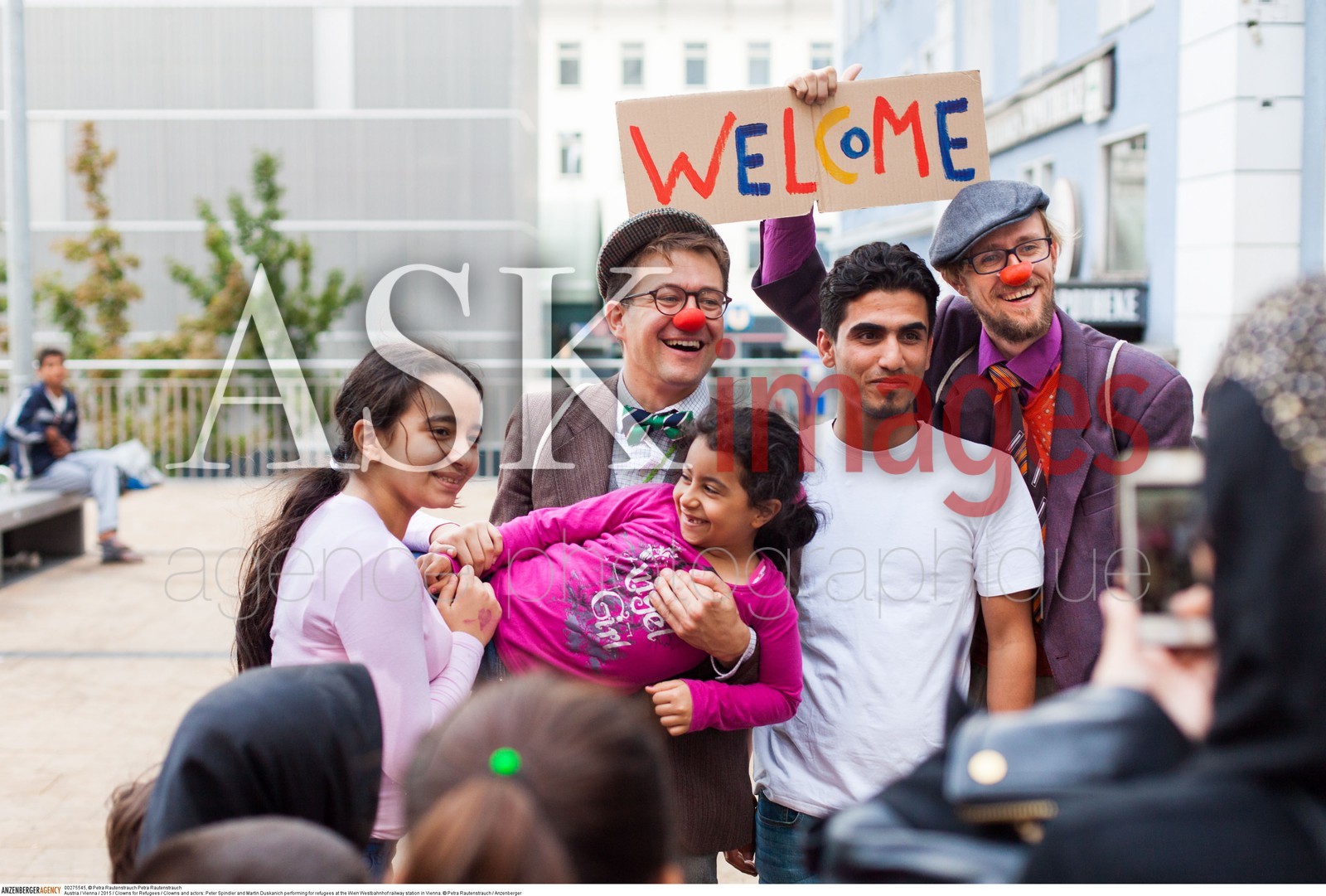 DescriptionAustria / Vienna / 2015 / Clowns for Refugees / Clowns and actors: Peter Spindler and Martin Duskanich performing for refugees at the Wien Westbahnhof railway station in Vienna..© Petra Rautenstrauch / Anzenberger/ASK Images