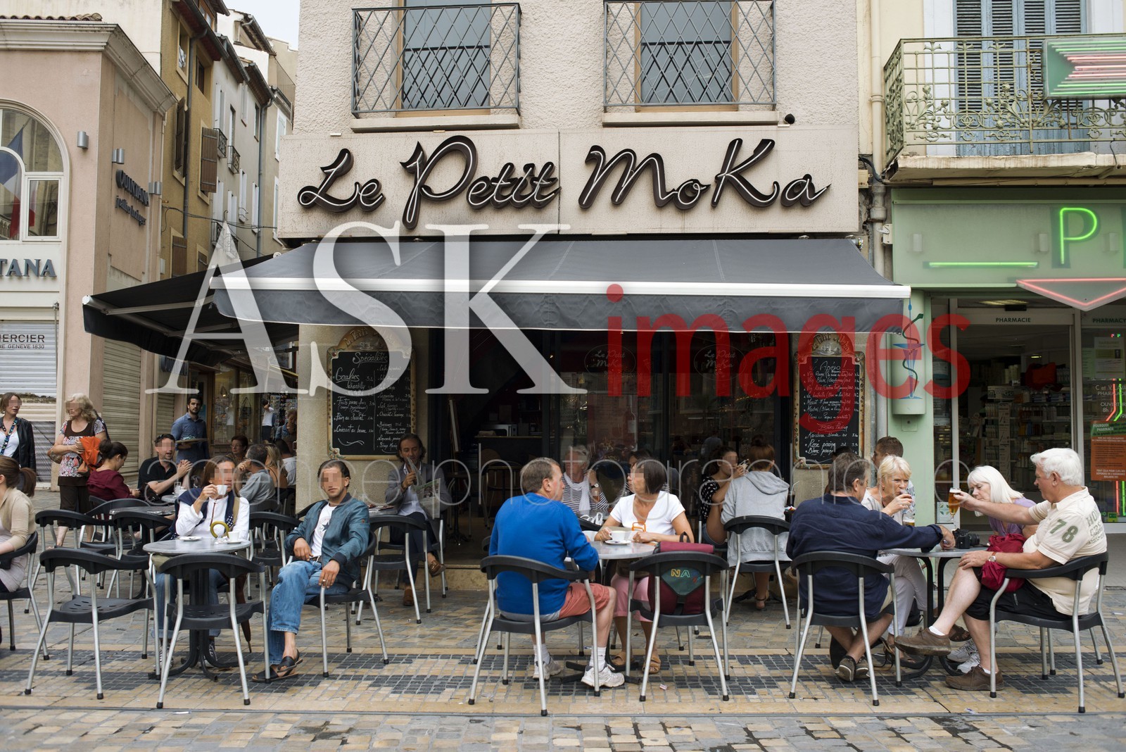 DescriptionLe Petit Moka bar restaurant at Town hall square. Pedestrian shopping street in old city central Narbonne, Languedoc-Roussilon, South of France. .