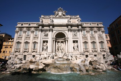 Trevi fountain supplied since two thousand years by the Aqua Virgo, one of four aqueducts bringing water source in Rome. Italy, Rome