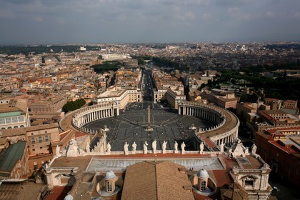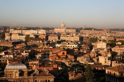 Rome, EUR district: the Colisee Square (1938) draws its great white mass punctuated by six storeys of arches above the Tiber. Italy, Rome