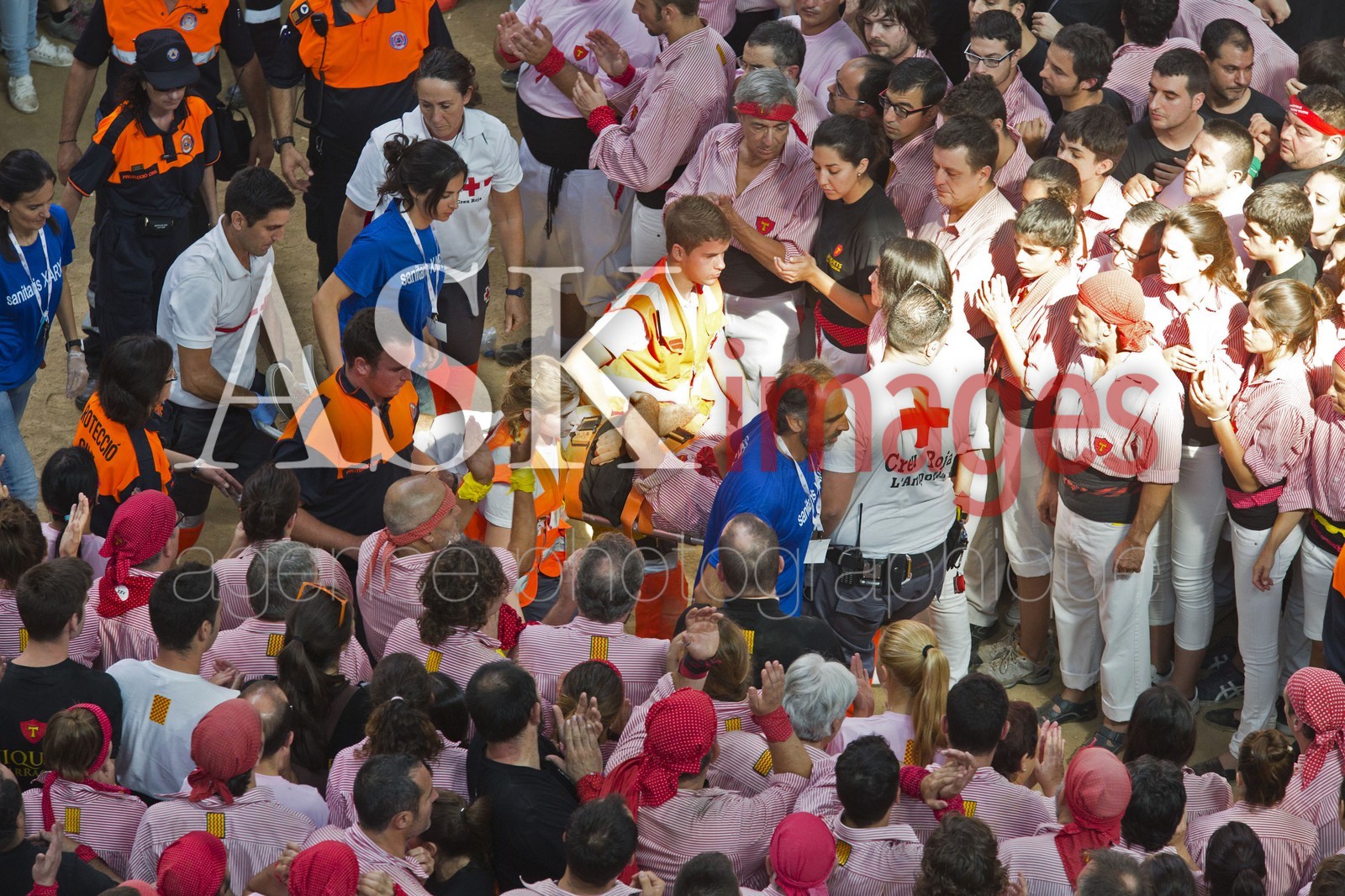 | Description | Spain, Tarragona, the XXV contest of Castells in Tarragona, Catalonia, is held in the arena Tarraco placa, an injuried person is evacuated |