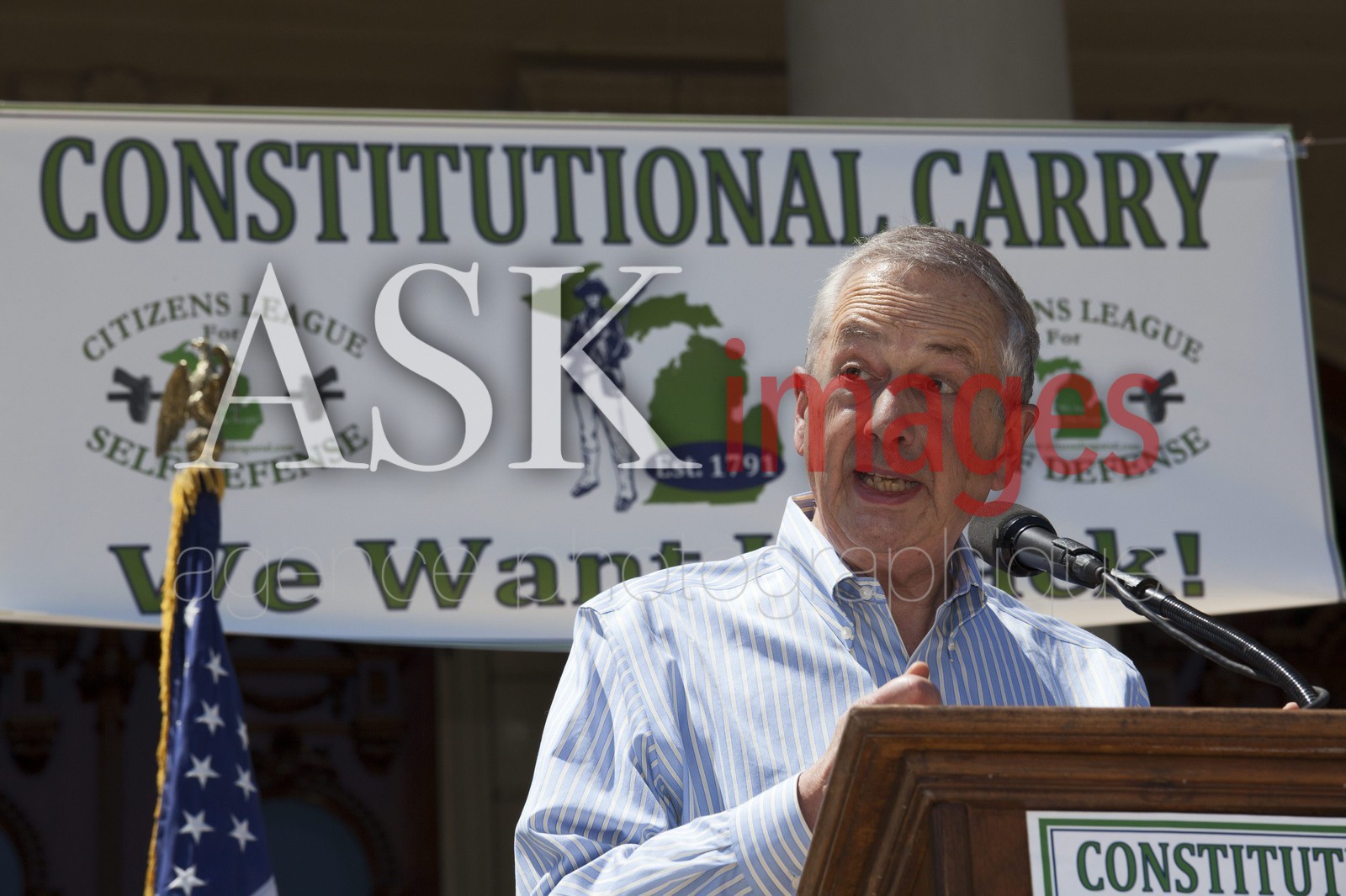 DescriptionLansing, Michigan - Larry Pratt, executive director of Gun Owners of America, speaks at a rally at the state capitol opposing a bill to repeal Michigan's "stand your ground" law. Michigan's law is similar to the Florida legislation publicized by the Trayvon Martin shooting; it allows gun owners to shoot to kill if they feel endangered, rather than first trying to retreat..© Jim West / The Image Works