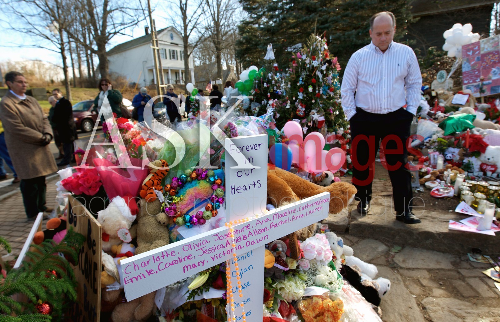 DescriptionNewtown, CT: December 19, 2012. A cross bears the names of the victims of the Sandy Hook Elementary School massacre as people pay tribute at a makeshift memorial on December 19, 2012 in Newtown, Connecticut. Last week the gunman, Adam Lanza, opened fired inside the school, killing 20 students and 6 adults, before turning the gun on himself. It is believed that Lanza suffered from mental illness and used his mother's weapons to carry out the shootings..