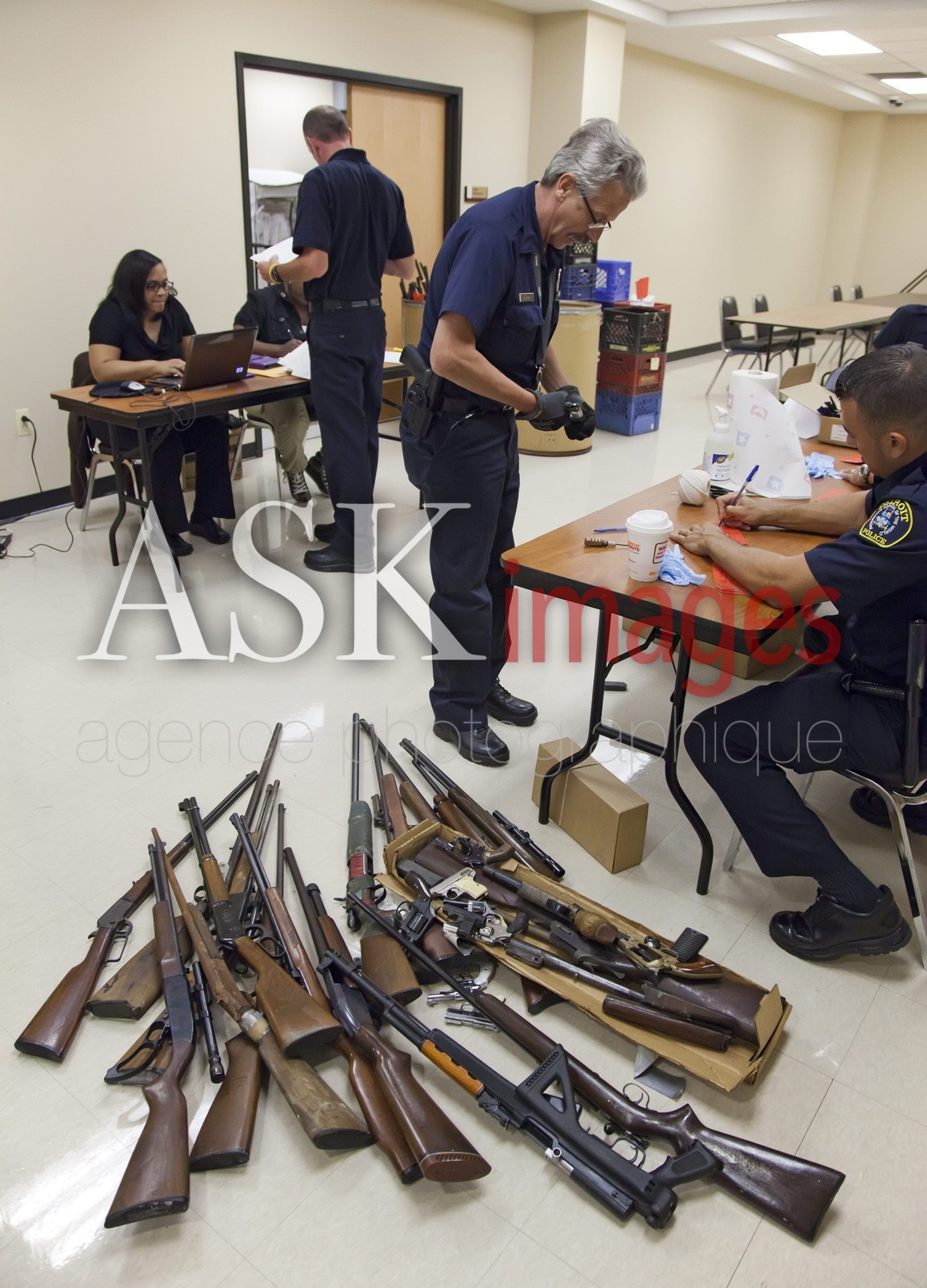 DescriptionDetroit, Michigan - Police officers examine weapons turned in by residents in a gun buyback program. People were paid $25 to $200, depending on the type and quantity of weapons turned in...©Jim West / The Image Works