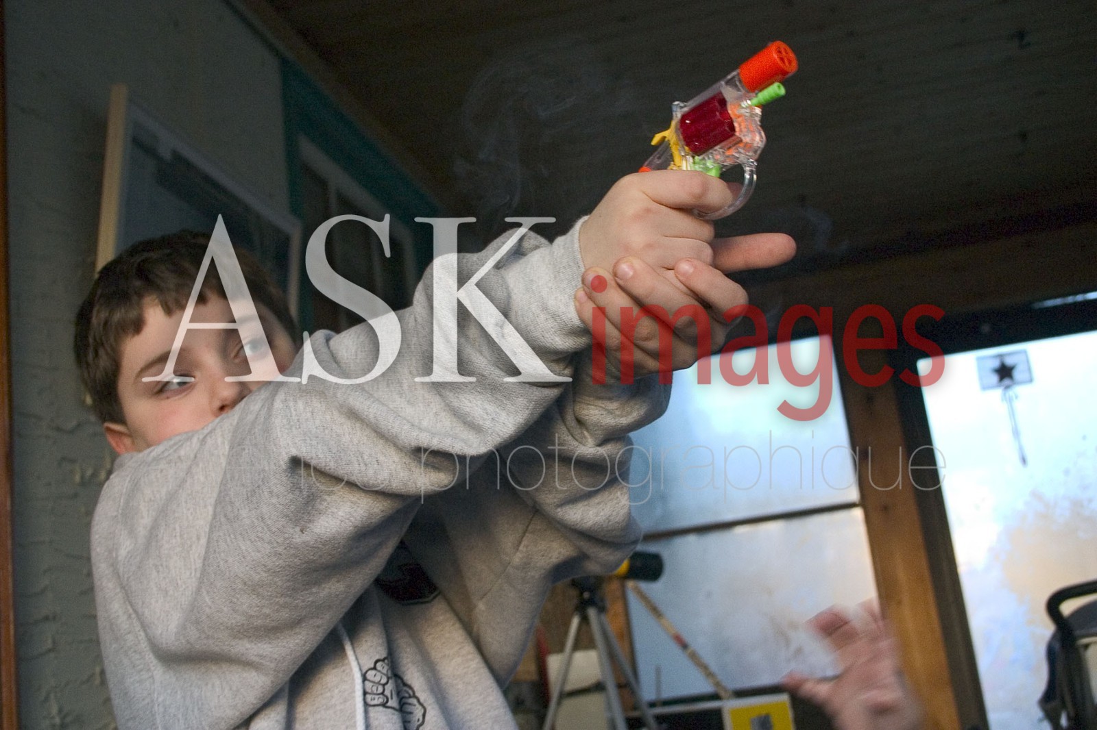 | Description | St Paul, Minnesota: Boy age 8 aiming colorful toy cap gun. MR PR ©Skjold Photographs / The Image Works |